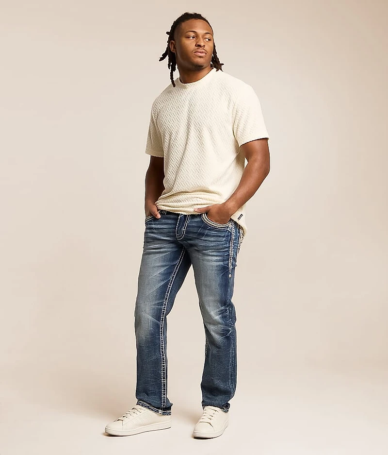 Regular fit jean Comfort stretch fabric Straight from knee to hem Low rise, 16 1/2" bottom opening Embroidered faux flap back pockets Zip fly