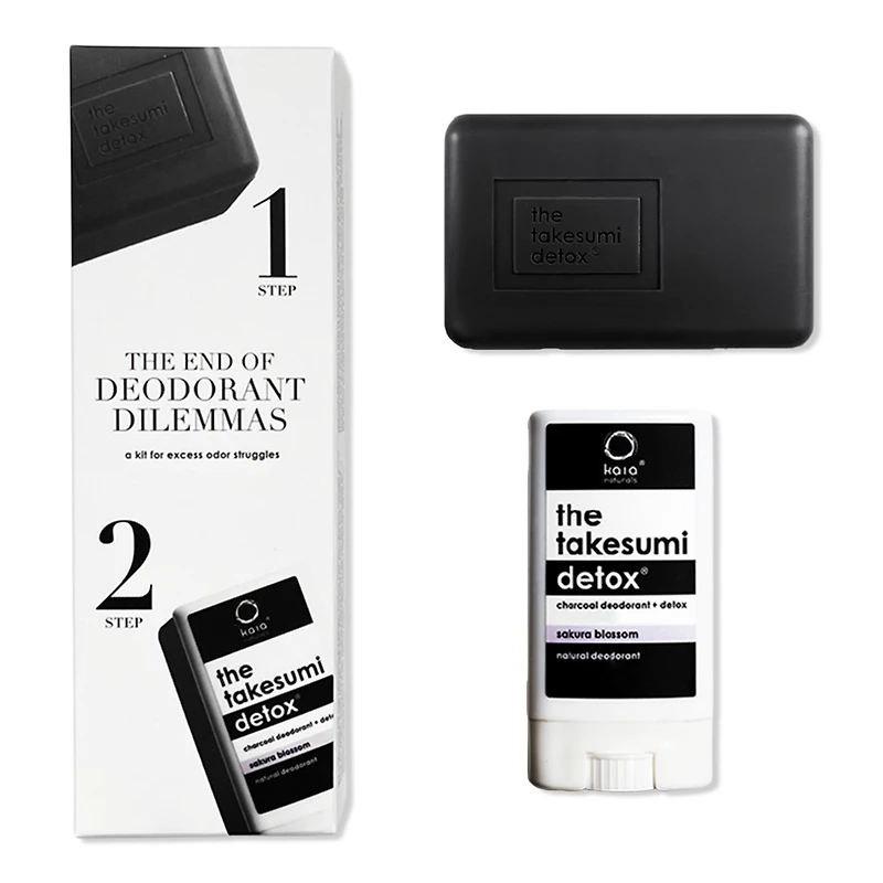 TAKESUMI DETOX STR KIT SAKURA BLOSSOM. Benefits: The takesumi detox two-step method is for natural deodorant users who struggle with excess odor. For natural deodorant success and maximum odor-protection. In the best-selling sakura blossom deodorant scent (lively - spring - blossom): the air fills with a sweet, elegant aroma as the airy pink blossoms bloom and float delicately off the trees. If you are switching from antiperspirant to natural deodorant, there will be a transition period (The Stages of Detox). Key Ingredients: Activated charcoal acts like a magnet to unclog pores and draw out impurities. Potent fermentation extract controls odor. Certified natural essential oil fragrance blend, no hidden toxins. Includes: Step 1: the underarm bar (2.4 oz). Step 2: the charcoal deodorant sakura blossom (0.42 oz).