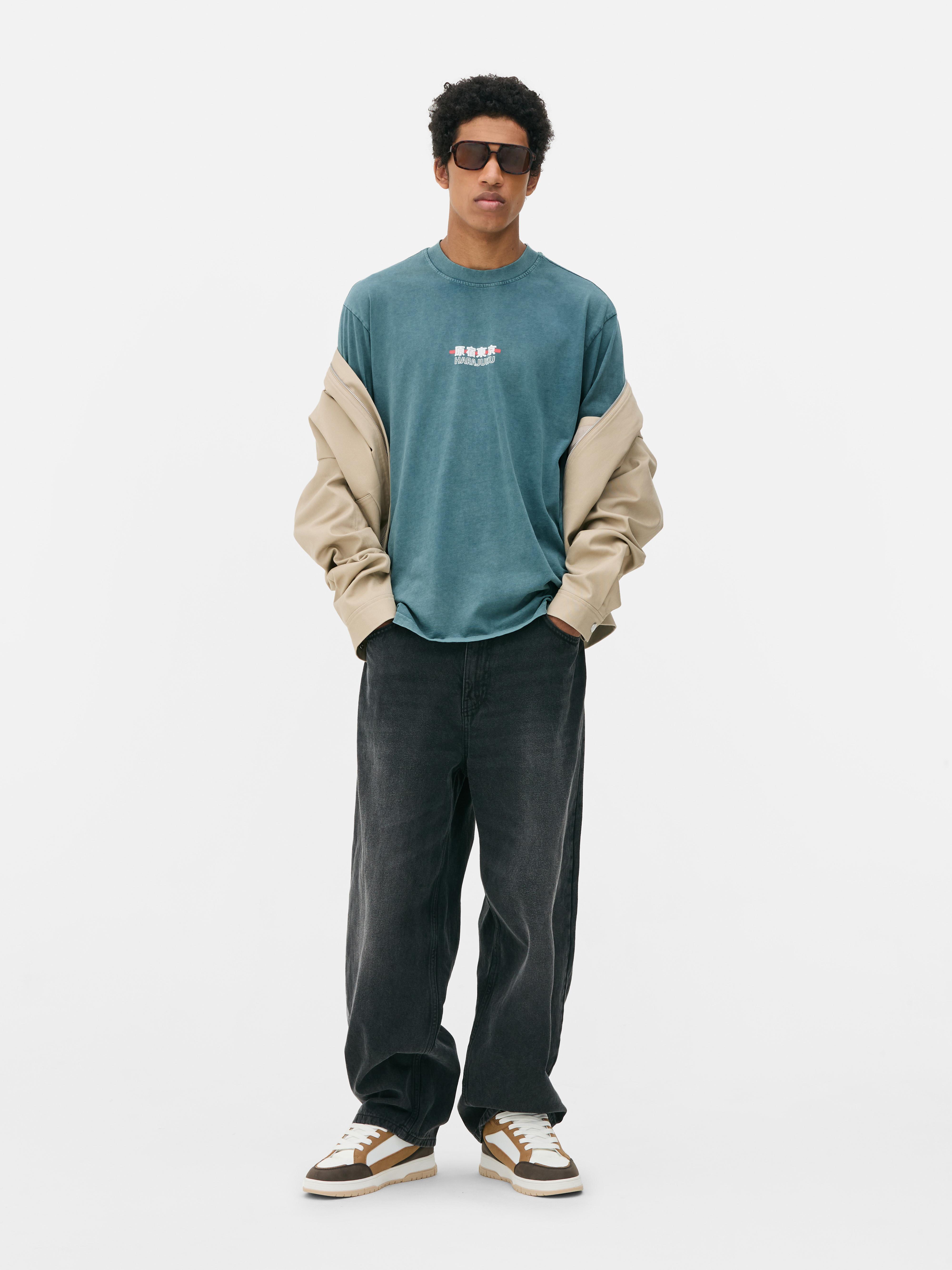 A short sleeved shirt with round neckline and kanju graphic design on the front