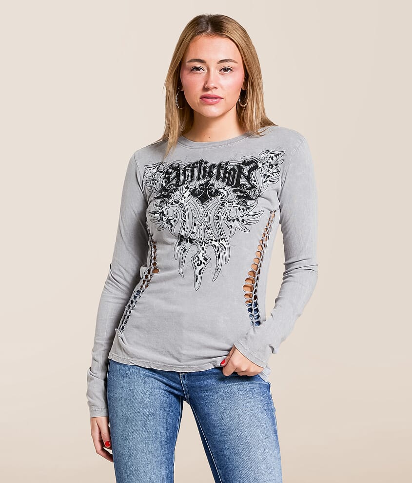 Rhinestone graphic animal print washed t-shirt Raw edge braid details Bust measures 33" on size small Body length 25" on size small
