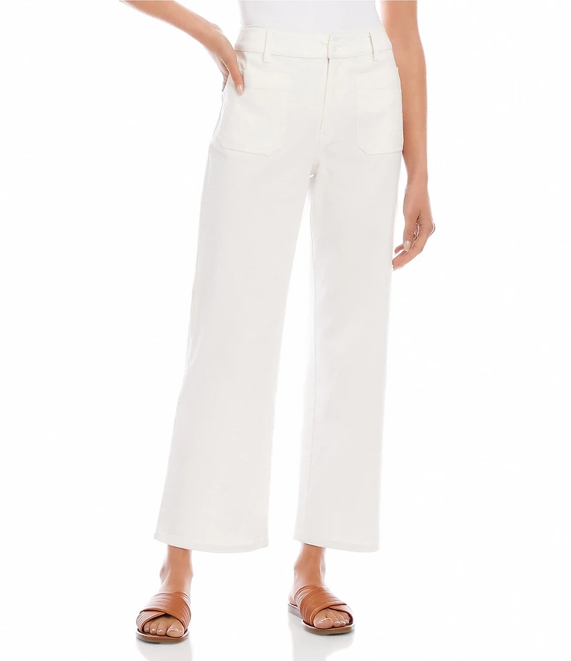 From Karen Kane, these pants feature: Stretch fabrication Wide-leg silhouette Belt loops Front and back patch pocket Cropped length Front button/zip closure Approx. 28" inseam, front rise: 10.875" length Cotton/spandex Machine wash cold/hang to dry Imported.