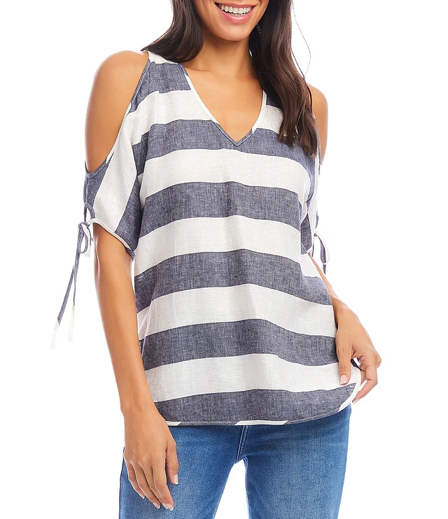 Karen Kane Linen Striped Cold Shoulder V-Neck Short Sleeve Top
