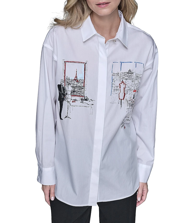 From KARL LAGERFELD PARIS, this shirt features: Woven poplin fabrication Point collar Long sleeves with cuffs Paris artwork design Shirttail hemline Button front closure Approx. 30" length Cotton Machine wash Imported.