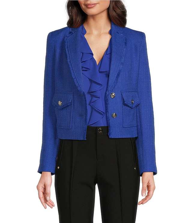KARL LAGERFELD PARIS Tweed Notch Lapel Long Sleeve Flap Pocket Two-Button Cropped Jacket
