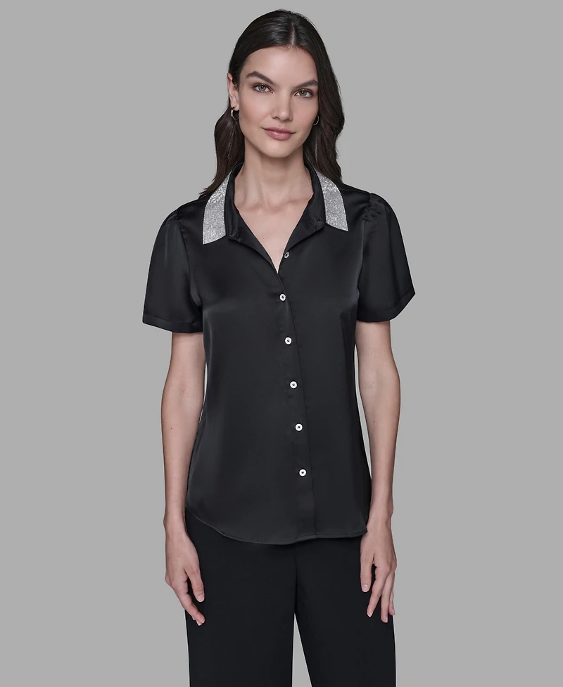 Redefine sophistication with this top by Karl Lagerfeld Paris featuring sparkling accents along the collar that catch the eye from every angle. The short sleeves ensure unrestricted movement, and the button placket closure provides a chic, adjustable fit.