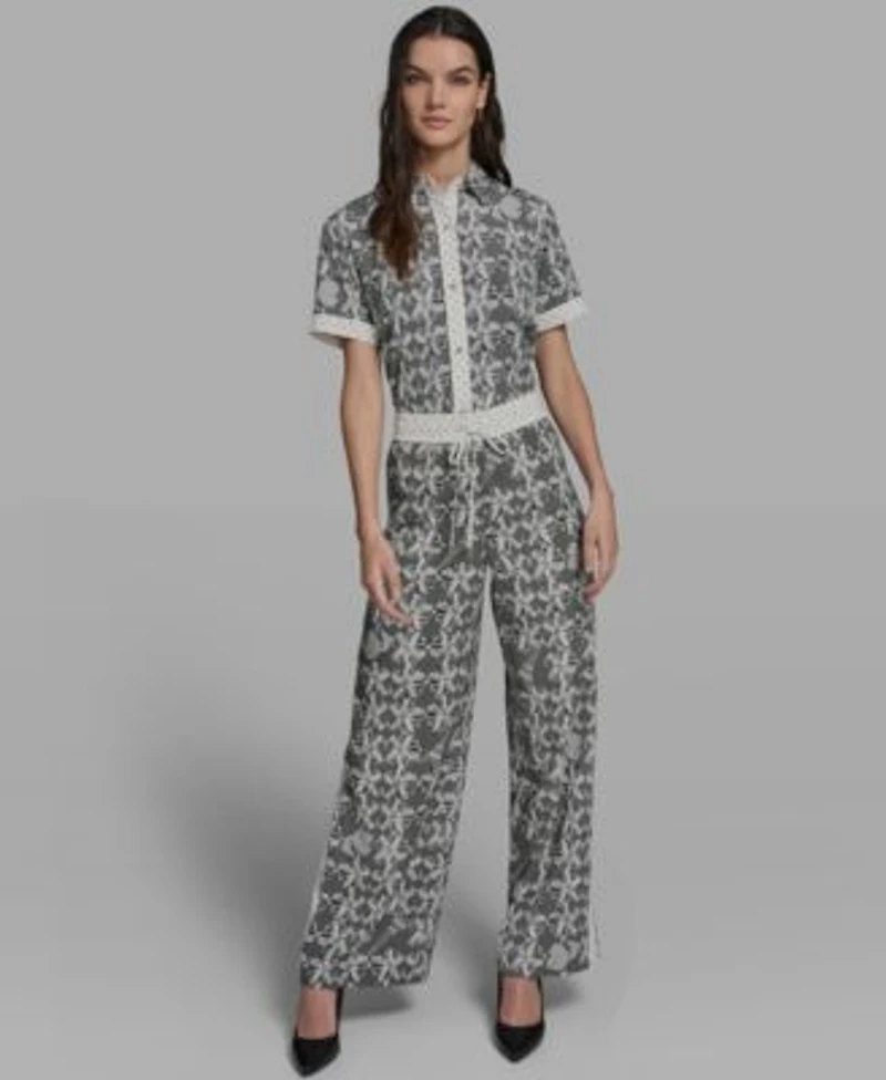 Karl Lagerfeld Paris Womens Lace Detail Camp Shirt Lace Print Soft Pull On Pants