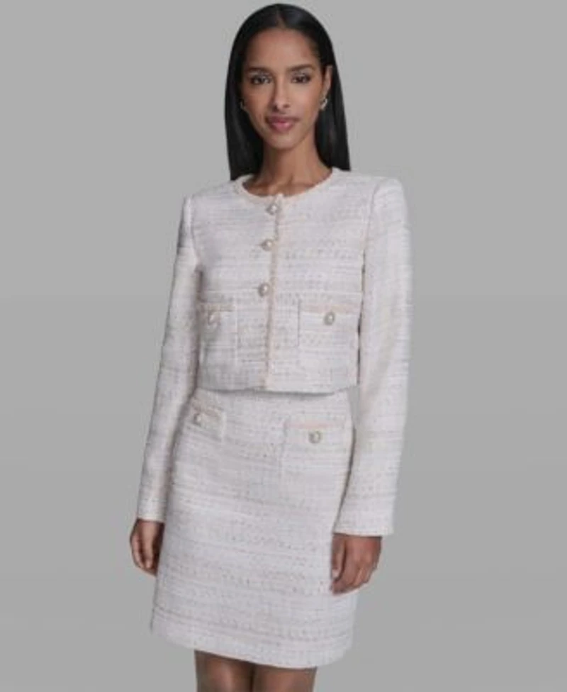 Layer on sophisticated style with the metallic tweed and imitation pearl buttons of this Karl Lagerfeld Paris jacket. Patch pockets add a functional, polished touch.