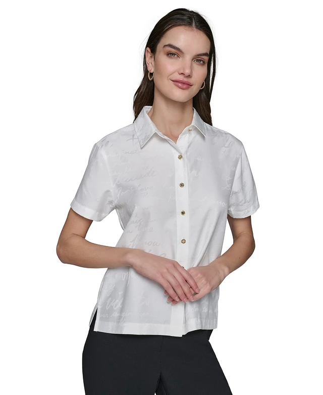 Karl Lagerfeld Paris Women's Tonal Script-Print Camp Shirt
