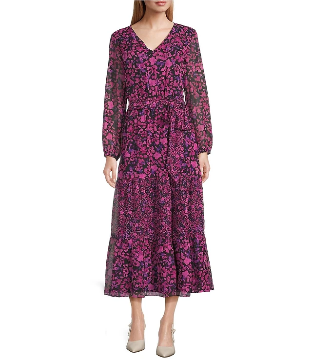 Kasper Floral Chiffon V-Neck Long Sleeve Belted Tiered Ruffle A-Line Midi Dress