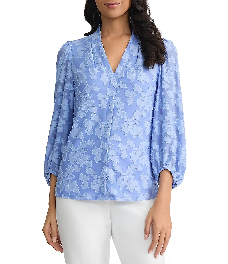 Kasper V-Neck Blouson Sleeve Floral Burnout BlouseKasper V-Neck Blouson Sleeve Floral Burnout Blouse