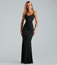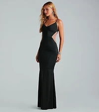 Showcase your fabulous curves in the Katalina formal rhinestone dress and achieve the perfect snatched figure! She features a sleeveless V-neckline adorned with adjustable spaghetti straps, and curved sheer mesh side inserts create a stunning hourglass illusion along her flattering mermaid silhouette and floor-length hem. The formal dress is crafted from a rhinestone-embellished knit fabric that sparkles under any light and has a short stretchy knit lining. Complete the look with a rhinestone teardrop necklace and heels for a black tie affair!