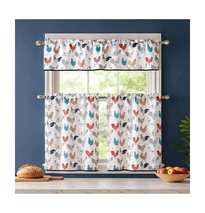 Bring cozy farmhouse charm to your kitchen with the Kate Aurora 3 Piece Cafe Rod Pocket Country Rooster Kitchen Curtain Tier and Valance Set. Designed with a cheerful rooster motif and classic checkered trim, this set includes two tier panels and one coordinating valance that instantly brighten any window. Made from durable yet lightweight polyester, the fabric softly filters sunlight while maintaining privacy. The easy-to-hang rod pocket construction fits most standard rods, offering a clean, tailored look. Perfect for kitchens, breakfast nooks, or dining spaces, this set blends beautifully with rustic or country-inspired decor. Machine washable for easy care.