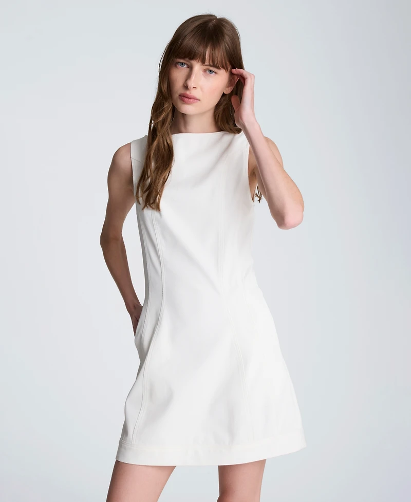 Minimalist lines take center stage in this Kenneth Cole mini dress, designed with a sculpted shape and boat neckline. Back zipper closure ensures a clean, body-conscious finish.