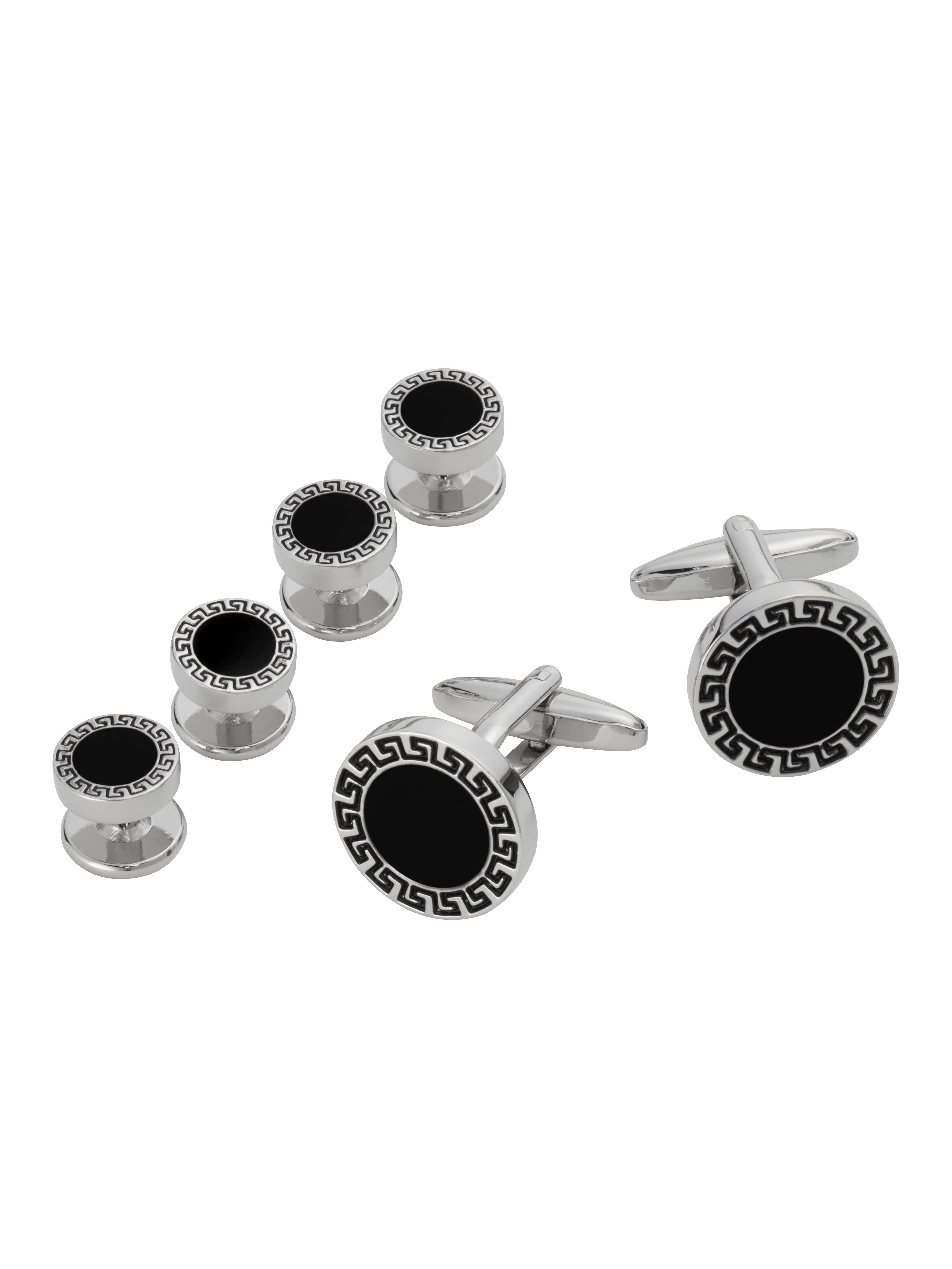Unlock next-level style with this Key Cufflinks & Studs Set. Featuring a sleek silver finish and bold black inlay, this set blends modern flair with timeless appeal. The engraved key border adds a unique touch, making it the perfect accent for business casual or formal occasions. Whether you're owning the boardroom or gracing homecoming events, these cufflinks and studs exude sophistication. Secure with a bullet-back design, they're as functional as they are fashionable. Subtle, striking, and versatile—this set elevates your ensemble with effortless class. Dress sharper—your sleeves will thank you.