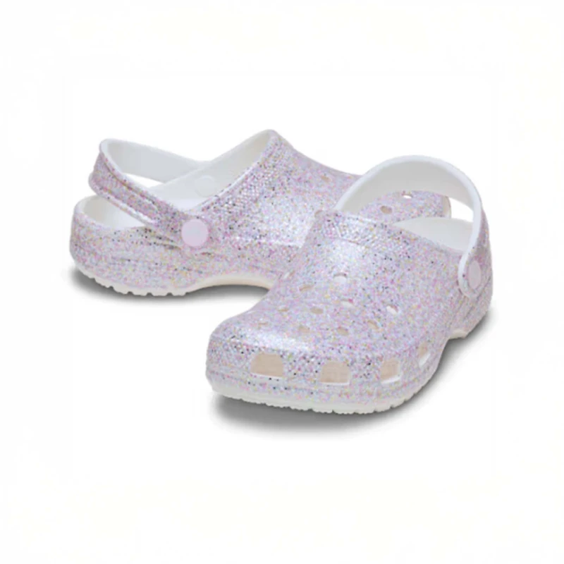 Shop Crocs Kids Classic Clogs in White Fantasy Glitter featuring lightweight comfort, sparkling glitter finish, and easy slip-on style perfect for everyday fun.