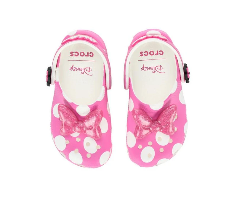 Kids' Crocs Infant & Toddler Minnie Mouse Clog The Crocs Minnie Mouse Classic Clog is a kids' clog designed for easy everyday wear. It features lightweight molded construction, a pivoting heel strap, and ventilation ports that help support comfort through play and casual outings. Minnie Mouse character details and a fixed bow accent give the style a playful finish.