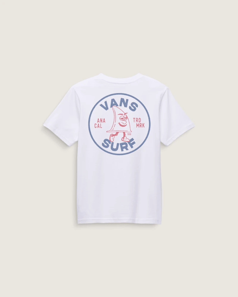 The Kids Huck Fin T-Shirt is a short sleeve crewneck tee made from a heavier weight cotton and features animated surfboard fin graphics.