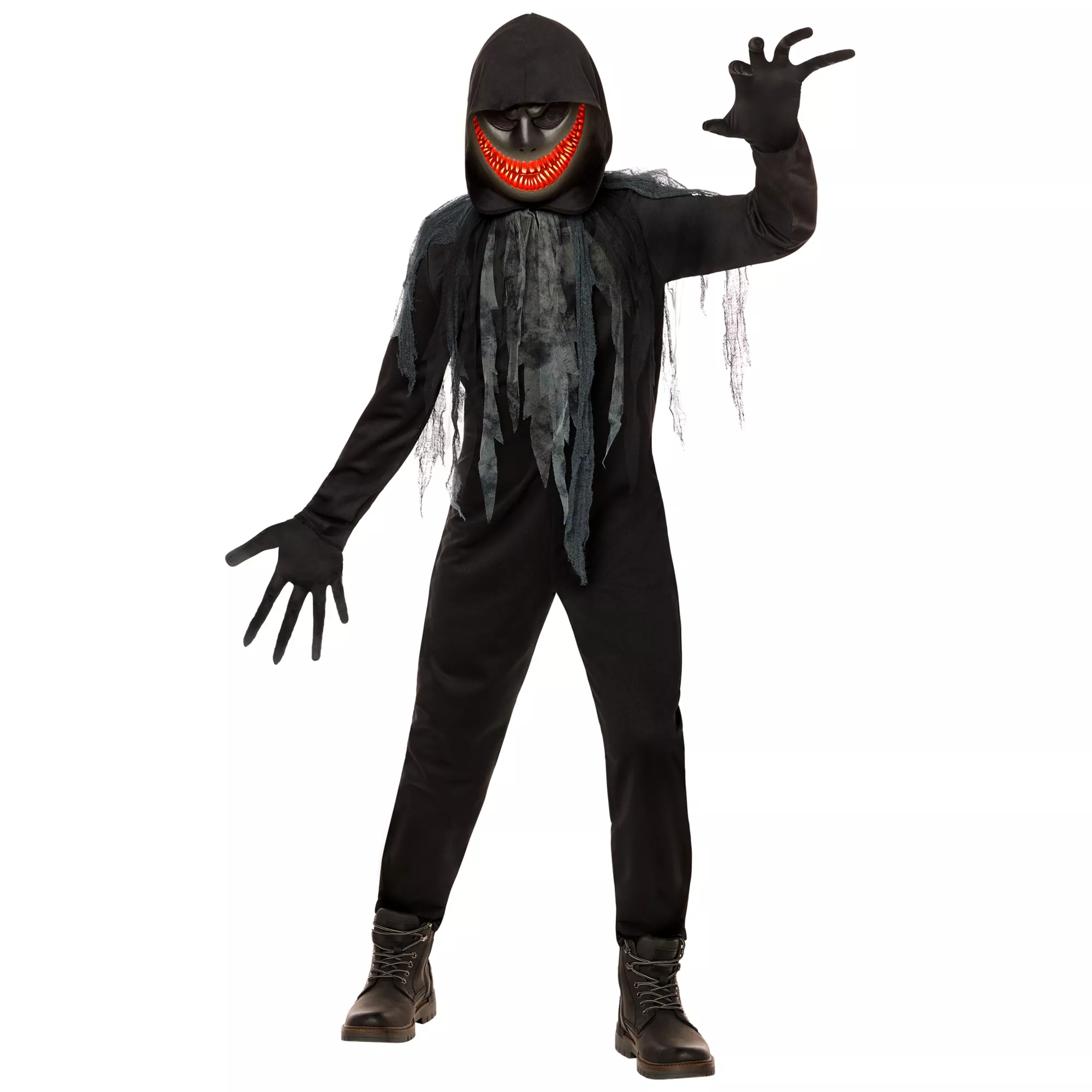 It isn't the dark that makes us afraid -- it's what lurks within it. Give all your friends the scare of their lives when they see you dressed in this Kids Midnight Creeper Costume this Halloween! Complete with a tattered hooded jumpsuit, long-fingered gloves, and a half mask with an eerie, glowing grin, this is one ensemble that's sure to send chills down everyone's spines.