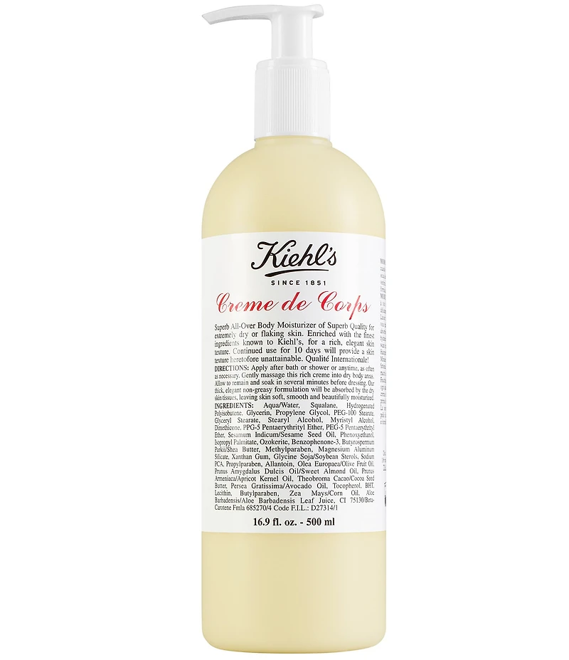Kiehl's Creme de Corps is a superb allover body moisturizer ideal for extremely dry or flaking skin. It's enriched with the finest ingredients known to Kiehl's to give you a rich, elegant skin texture and leaves skin soft, smooth and beautifully moisturized. Winner of Glamour magazine's '2019 Beauty Award' for Best Body Lotion. How to Apply: Apply body moisturizing cream after bath or shower or anytime, as often as necessary Gently massage this rich creme into dry body areas Allow to remain and soak in several minutes before dressing Kiehls Insider Tip: Apply after bath or shower and allow to dry before dressing. And dont forget to try Kiehl's Creme de Corps Soy Milk & Honey Body Polish which gently exfoliates and nurtures skin to deliver optimal hydration. Key Ingredients: Beta-Carotene - is a naturally derived antioxidant predominantly found in many orange/red vegetables such as carrots. It is used in Vitamin A production and gives an orange tint when used in skin care products. Cocoa Butter - is a yellowy lipid expressed from the roasted seeds of the cocoa plant. It is solid at room temperature but melts at body temperature. It softens and lubricates skin and is used in a variety of skin care formulations. Sesame Oil - a refined moisturizing oil derived from Sesame Seeds, has the same emollient properties as other nut and vegetable oils and is commonly used as a carrier oil for skin care products. Absorbs easily and softens the skin. Made in the USA.