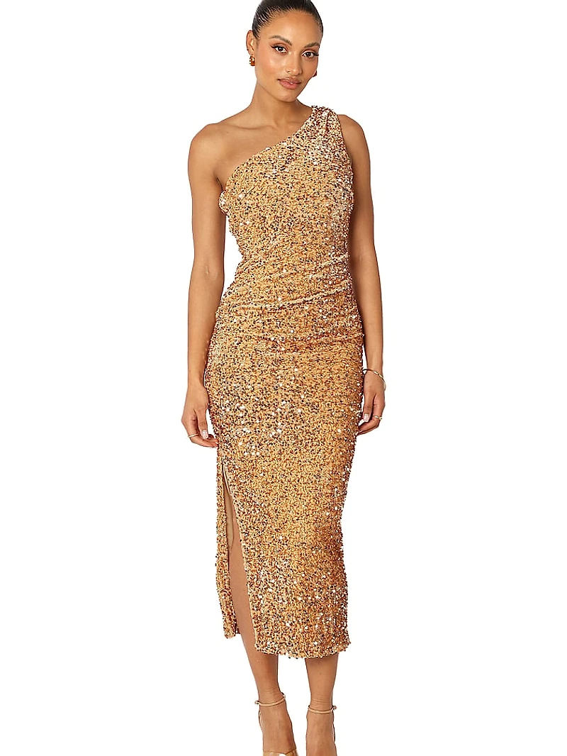 Sparkle and shine in this one-shoulder midi Dress, rendered with a sexy bodycon fit, stretch velvet fabric, and sequin detailing.