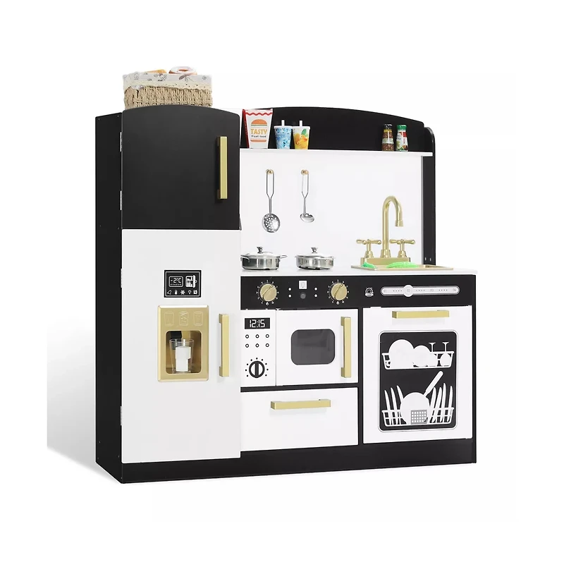 Inspire hours of imaginative play with this interactive wooden kitchen playset designed for budding little chefs! Featuring a realistic microwave, working ice maker that dispenses toy ""ice cubes,"" and a built-in dishwasher, this kitchen brings everyday cooking fun to life. The set includes 3 utensils, 2 pots, 1 cup, and 2 pretend ice cubes, encouraging hands-on exploration. With smart storage spaces and smooth, child-safe finishes, it's built for both safety and learning. Perfect for developing fine motor skills, coordination, organization, and social interaction, this educational toy is ideal for kids ages 3 and up.