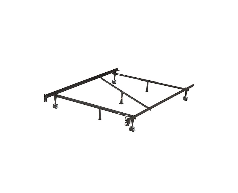 This commercial grade bed frame is the next level option for supporting your mattress. The black frame is made of heavy-duty extra thick steel rails and is easily extendable to fit twin, full, or queen sizes. A center support rail provides extra support. Seven legs hold up this frame, four of which have caster wheels for smooth movement. Two of the wheels lock to immobilize the frame in place. Headboard attachment is made easy with the included two headboard brackets (headboard not included).