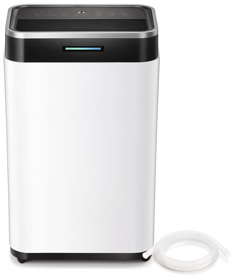 This dehumidifier offers intelligent operation with three modes—Auto, Cnt, and Sleep—allowing you to choose the ideal setting for your needs. Equipped with a smart humidity sensor, it displays the current humidity level through Led color lights: blue for low (below 45%), green for optimal (45%-65%), and red for high humidity (above 65%). Featuring two drainage options, the unit comes with a 6500ml water tank that is easy to remove and clean, or you can opt for continuous drainage with the included hose for hassle-free water disposal. Its compact design (13.4 x 9.5 x 19.7 inches) and lightweight build (32 lbs) make it easy to move around your home using the four universal wheels. Perfect for areas up to 269 sq. ft., it s ideal for bathrooms, basements, kitchens, and living rooms, offering a comfortable environment with a temperature range of 41-100 . In addition to dehumidifying, the built-in dual filter screen absorbs dust and odors, ensuring cleaner air and promoting better health.