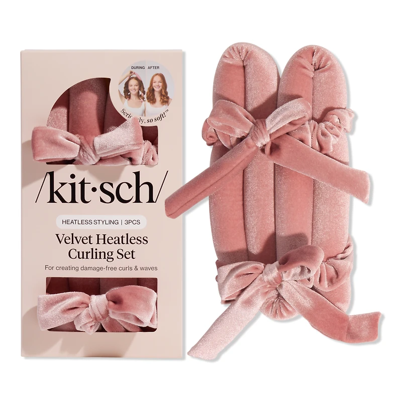 VELVET HEATLESS CURLING SET TERRACOTTA. Benefits: Create healthier, heatless curls and waves. Features: Extra-soft velvet gently grips slippery and freshly washed strands. Suitable for most hair types, textures, and lengths. Can used on dry hair, day or night. Includes: One velvet curling rod and two velvet bow scrunchies too.