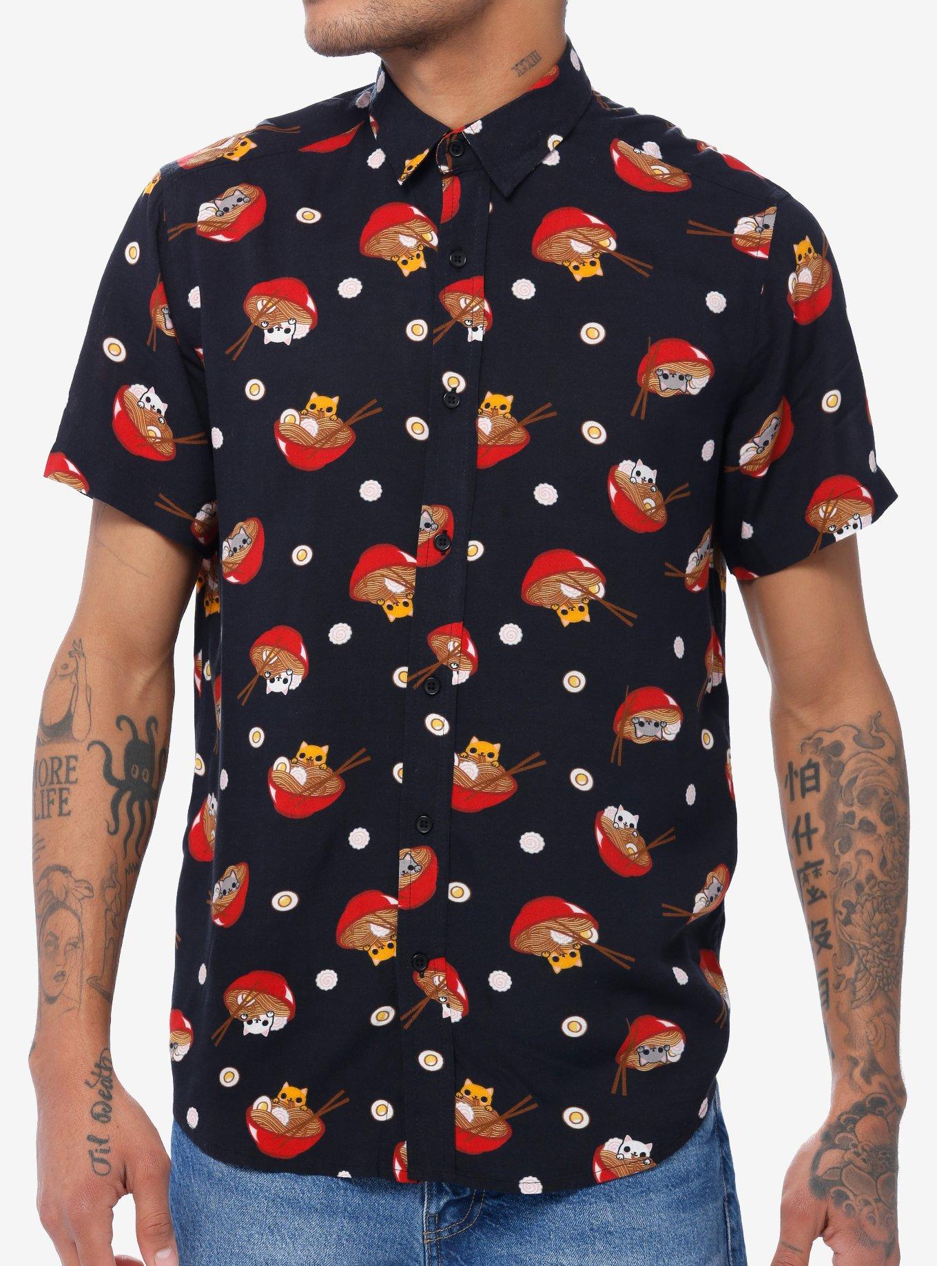 These bowls of ramen were made to purrfection! This woven button-up features an allover print of eggs and kitties in ramen bowls.