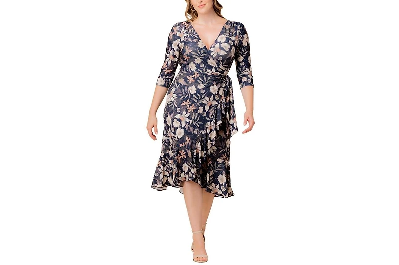 Kiyonna Plus Flirty Flounce Midi Wrap Dress with 3/4 Sleeves