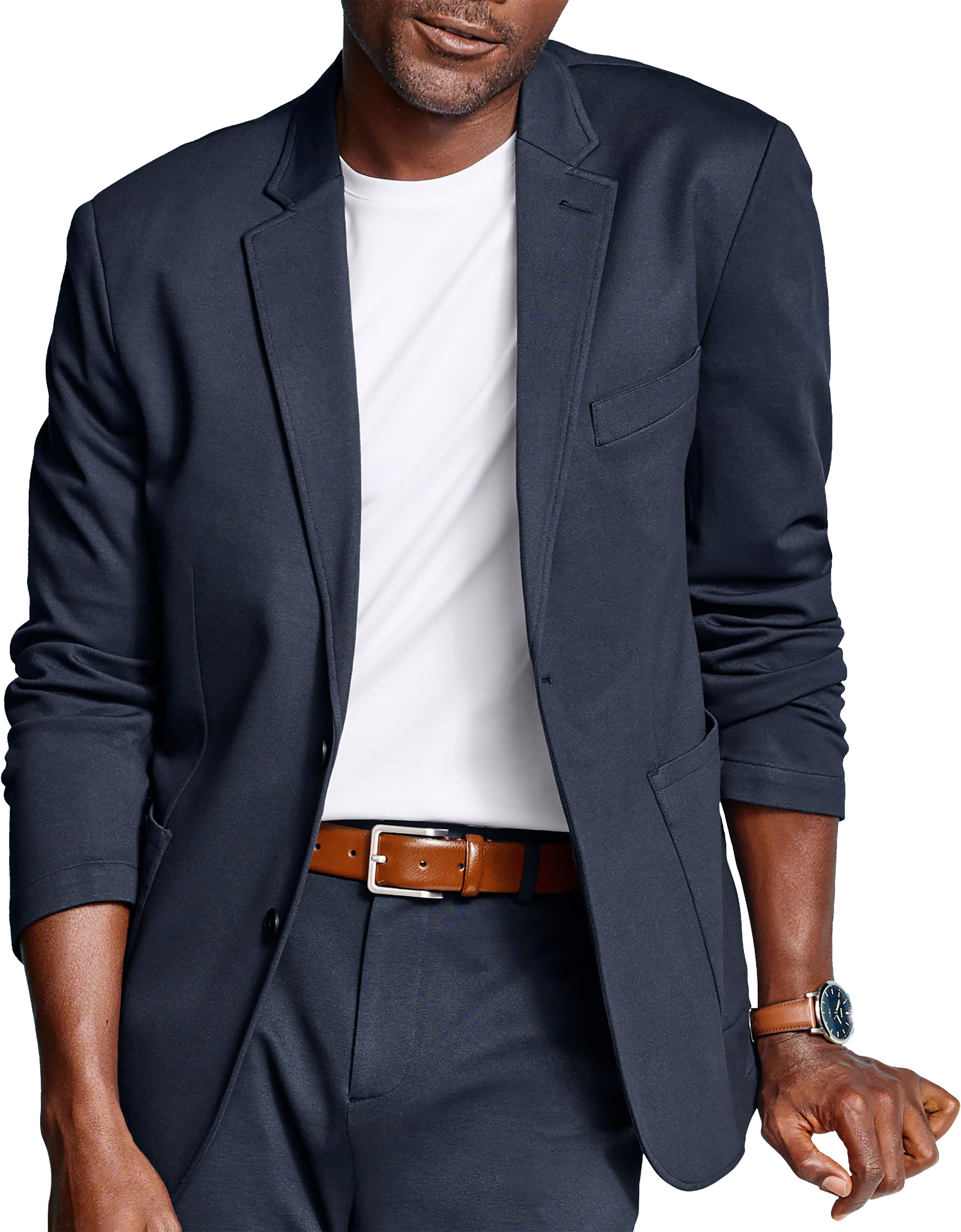 Dress code: Effortlessly sharp. This modern fit knit blazer has you covered from boardroom musings to date-night vibes. Soft, stretchy, and lightweight, it moves as you do, while the classic notched collar and two-button detail keep things timelessly dapper. Pair it with jeans for a smart-casual flex or dress pants for a polished finish. Confidence looks good on you, and with this blazer, it feels even better. Quiet luxury? Loud compliments.