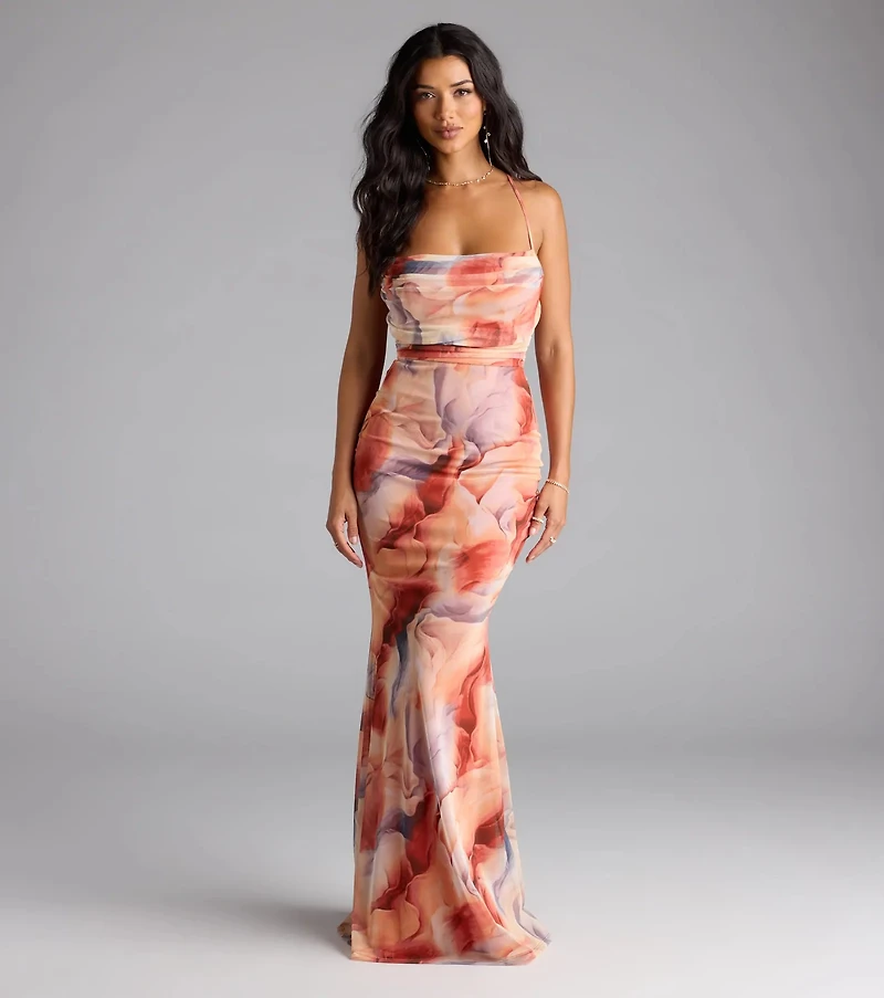 Special Occasion Bold, daring, and ultra flattering. The Korey formal dress makes a statement with a sultry lace-up back, a mermaid silhouette that hugs your curves, and a floor-length hem for a bit of drama! Fit & Features Abstract print, mesh fabric, stretchy knit lining Cowl neckline, spaghetti straps Lace-up back Mermaid silhouette, floor-length hem Runs true to size   Where to Wear: Prom, weddings, big milestone parties, sunset dinner dates, birthdays, cocktail soirees