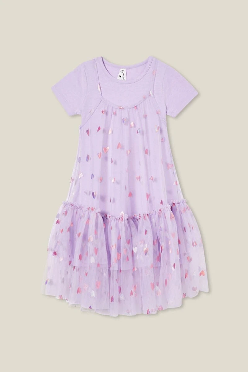 Outfit changes not required. The Kristen Dress Up Dress is a two-piece set that's ready for parties, playtime, and everything in between. A jersey lining dress with cap sleeves sits underneath a tulle overlay with ruffles at the hem. The relaxed A-line shape and round neckline keep it comfy while they're playing, and the novelty heart print adds a fun touch. Easy to pair with their favourite shoes and accessories.
