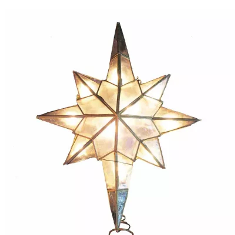 This Kurt Adler 10-Light Capiz Star Clear Treetop is a beautiful, classic way to add to the lighting and decor of your Christmas tree. With an 8-pointed, multi-faceted design, this treetop resembles the Star of Bethlehem with a gold trim and clear lights, and is for indoor-use only. Includes replacement R42 bulbs. Treetop measures about 10.8" in length.