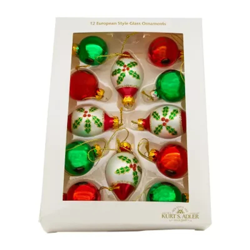 The 35mm glass green and red ball and finial 12-piece ornament set from Kurt Adler is a festive and colorful collection of decorative objects that will add a touch of cheer to your holiday decor. Each piece in the set is expertly crafted from high-quality glass and features a vibrant red or green finish that pops against the holiday greenery. The set includes 4 red ball ornaments, 4 green ball ornaments and 4 finial ornaments featuring holly berries and leaves. The ornaments measure 35mm and the finials are adorned with intricate detailing and sparkling accents. Whether displayed on a Christmas tree or hung in a window, these ornaments are sure to add a touch of cheer and holiday spirit to any home.