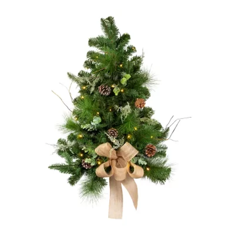 The 26-inch pre-lit snowy silver wall tree is a decorative item used for holiday or festive occasions.It is designed to be mounted on a wall and has a silver color, giving it a snowy appearance.It comes with a silver bow at the bottom and is pre-lit with 30 battery-operated led lights, which give it a warm, glowing appearance.The tree runs on 3 "aa" batteries (not included).