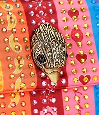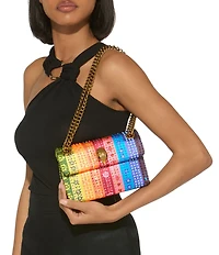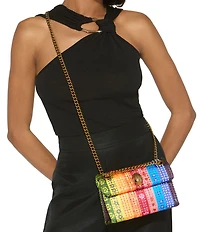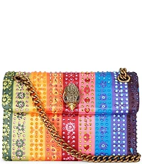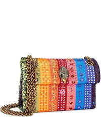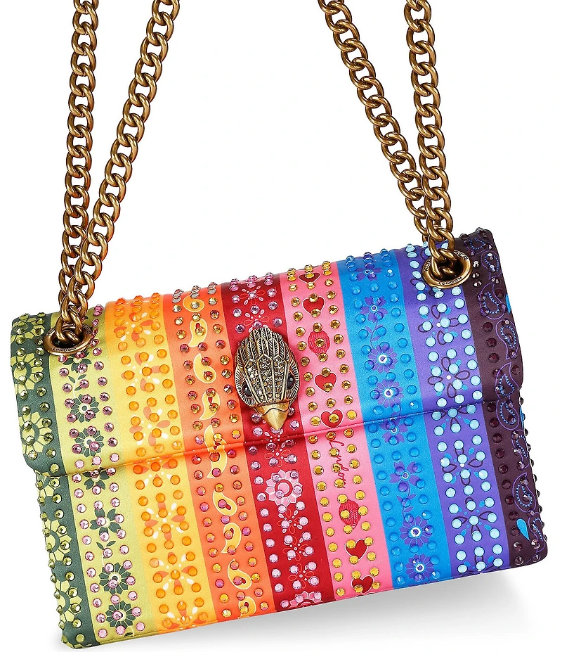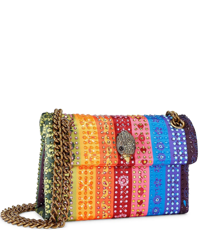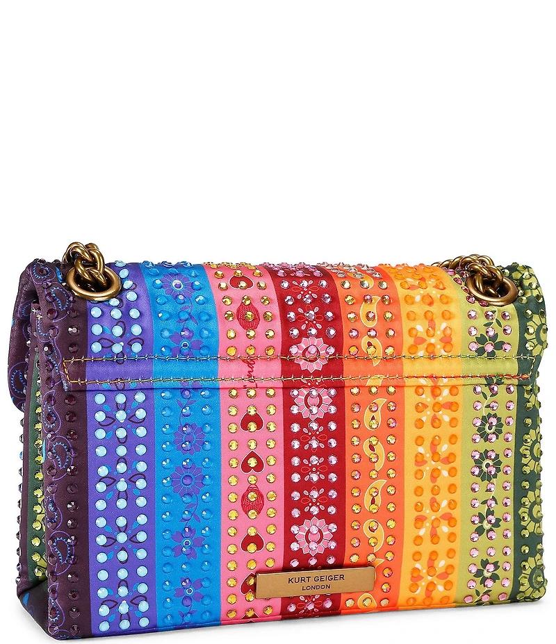 From Kurt Geiger London, the Fabric Mini Kensington Crossbody Bag features: Convertible crossbody / shoulder strap Polyester exterior in striped multi-colored prints Crystal glass trim Magnetic snap closure with bronze eagle head detail Polyester lining Interior single compartment Approx. 7.87" L x 5.51" H x 2.36" W Approx. 22.44" crossbody strap drop Imported.