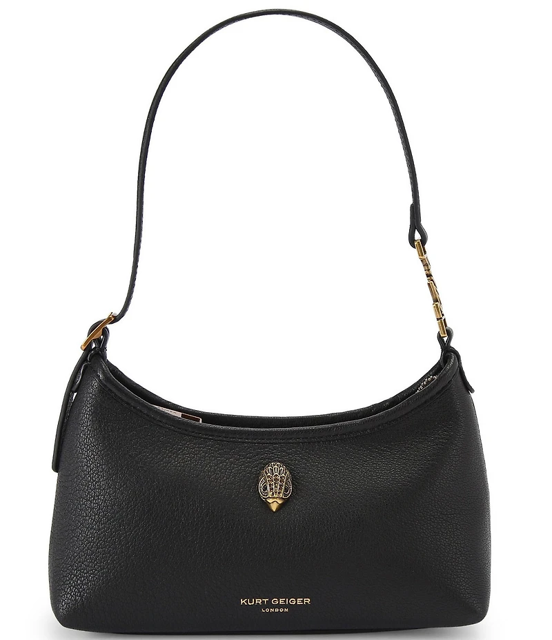 From Kurt Geiger London, the Kurt Sling Shoulder Bag features: Leather exterior Synthetic lining Single adjustable strap Brass hardware and eagle head Colorways include: Black with bronze hardware Metallic gold with gold hardware Lilac with bronze hardware White with gold hardware Zip closure Internal pocket Strap drop approx. 9.05" H Approx. 8.46" L x 3.14" H x 4.33" W Imported.