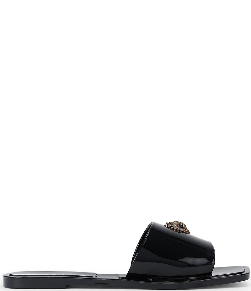 From Kurt Geiger London, the Maddison Jelly Ombre Logo Ornament Slide Sandals feature: Ombre Synthetic upper Squared toe Eagle head ornament Slip on banded styling Synthetic lining Synthetic outsole Flat heel Imported.