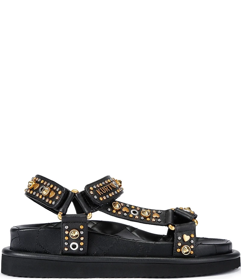 From Kurt Geiger London, the Orson Leather Studded Slingback Sandals feature: Leather upper Stud and jewel detail Hook-and-loop strap closure Synthetic lining EVA outsole Imported.