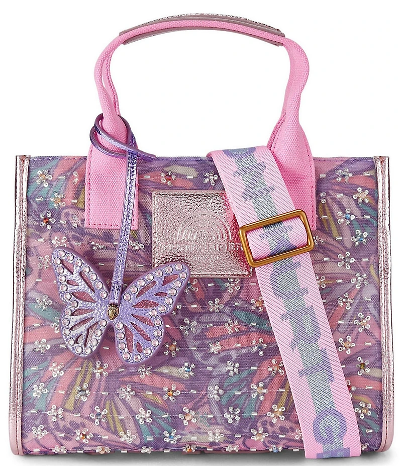 From Kurt Geiger London, the Small Southbank Tote Bag features: Fabric & mesh exterior in butterfly print, embellished with small beaded flowers Metallic pink trim Unlined Brass hardware with butterfly luggage tag Zipper closure Inner pocket with two internal lining pockets Double handle with single adjustable and removable strap Kurt branding on bottom of bag Approx. 35.43" strap drop Dimensions approx. 8.26'' H x 10.23'' L x 4.72'' D Imported.