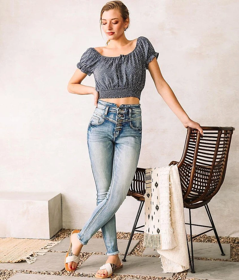Kurvy Ultra High Rise - An ultra high rise for an ultra fabulous fit. The ultra high rise sits at or above the natural waistline. Featuring a gap proof waistband that contours and defines your curves. Ultra high rise ankle skinny Button fly Stretch fabric Curvy fit, gap proof, contoured waist that defines your curves 9 1/2" bottom opening Destruction, frayed hem, and notched waistband piecing details Shoe sku 960465 Model Info: Height: 5'6 1/2" | Bust: 32 1/2" | Waist: 24" | Hip: 34" | Wearing Size: 25x29