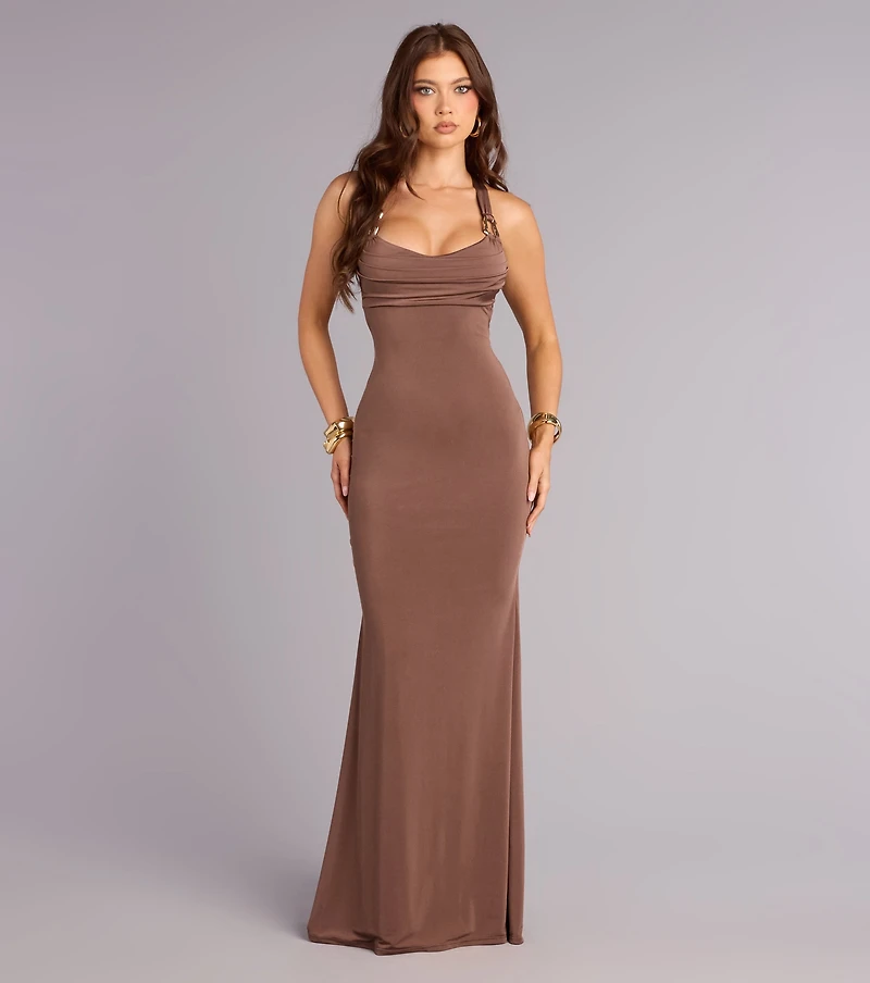Sleek and sculpted with a hint of edge, the Kylie floor-length gown is made for the kind of entrance that lingers. The strappy tie open back with hardware accents adds an unexpected twist, while the mermaid silhouette effortlessly puts your curves on display.
