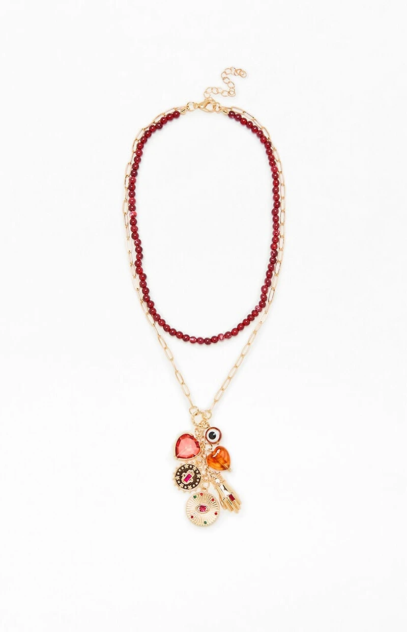 The Alice Beaded Charm Layered Necklace from LA Hearts makes accessorizing easy with two separate necklaces. Each one brings its own charm—featuring a beaded and gold chain made in a layered design, it also features various charms including hearts, a hand and eye charms all finished with lobster clasp closures for a secure fit.