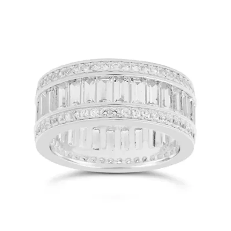 Make a bold statement with this stunning sterling silver lab-created white sapphire ring. Featuring a total of 1.12 cttw, the design showcases a striking baguette-cut center stone accented by sparkling round stones in a shared prong setting, creating a brilliant, cohesive sparkle. The polished 8 mm wide band offers a modern, substantial look while ensuring comfortable wear. Beautifully boxed, this elegant ring is perfect for special occasions or as a standout addition to any jewelry collection. 95 Polished finish Prong setting Thailand Imported Product Specifications 8mm 1.12 Material & Care Metal, Sterling silver Use silver polishing cloth on silver items.