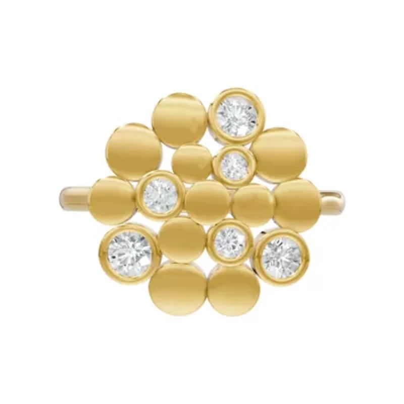 Elegant and modern, this cluster ring is crafted in radiant 18K vermeil plating and accented with sparkling lab-grown diamonds. Featuring six round diamonds arranged in a refined cluster design, the ring offers a total carat weight of 0.36 carats. Each stone is bezel set for a sleek, contemporary finish that enhances brilliance while providing secure, comfortable wear. Perfect for everyday elegance or special occasions. 6 Color rating: E Clarity rating: VS1 Bezel setting United States Imported Product Specifications 7 0.362 Material & Care Metal, Gold plated Clean with a soft cloth.