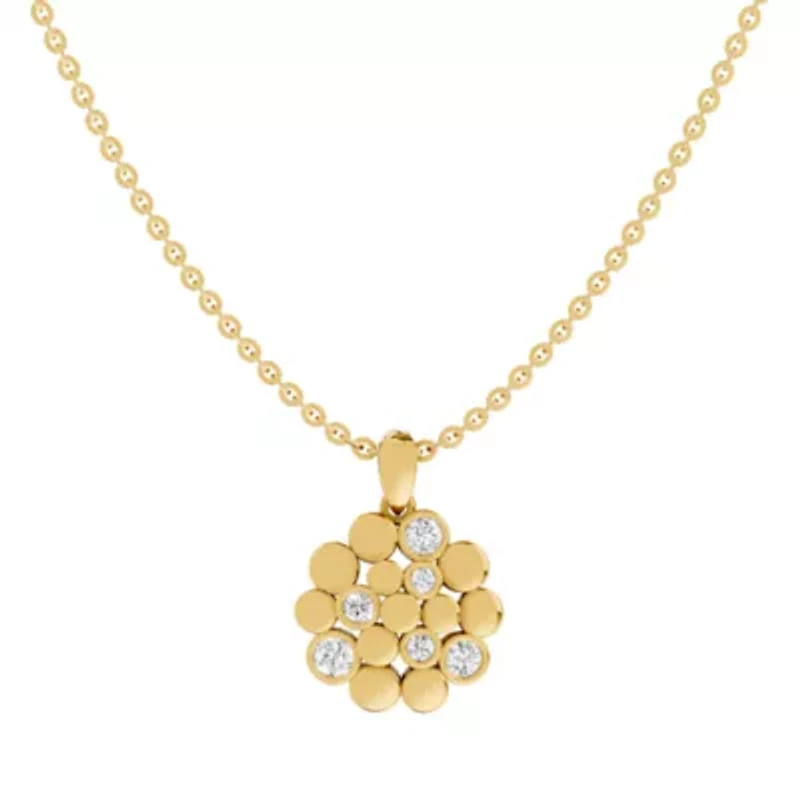 Add a touch of sparkle to any outfit with this elegant pendant necklace, crafted in radiant 18K vermeil plating. Featuring six round lab-grown diamonds with a total carat weight of 0.36 carats, each stone is bezel set for a sleek, secure, and modern finish. The refined design makes this necklace perfect for everyday wear or special occasions, delivering timeless elegance with contemporary style. Lobster closure, 6 Color rating: E Clarity rating: VS1 Bezel setting United States Imported Product Specifications 18 0.362 Material & Care Metal, Gold plated Clean with a soft cloth.