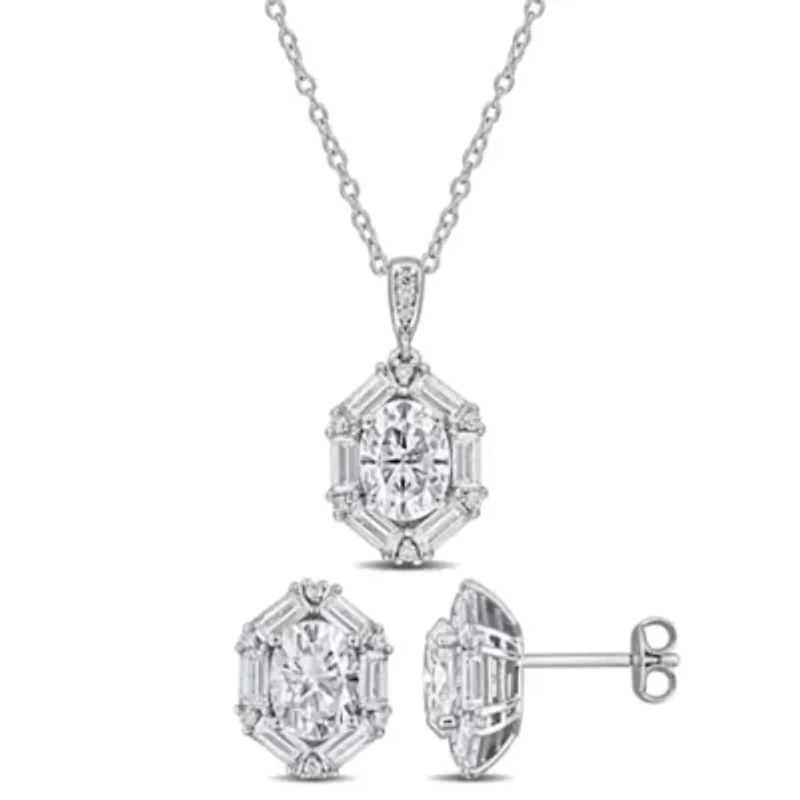 Make a dazzling statement with this multi-shaped created moissanite pendant and stud earrings set. Set in polished sterling silver, each sparkling stone catches the light brilliantly, creating a radiant, sophisticated shimmer. The coordinated pendant and earrings add elegance to any outfit, perfect for both special occasions and everyday refinement. A timeless set that blends modern style with classic beauty. 2 Post back, Lobster closure, 42 created white moissanite Polished finish Prong setting Warranty available, 60 days Thailand Imported Product Specifications 17" 7.57 ct. t.g.w. created white moissanite Material & Care Sterling Silver Metal, Sterling silver Clean with a soft cloth.