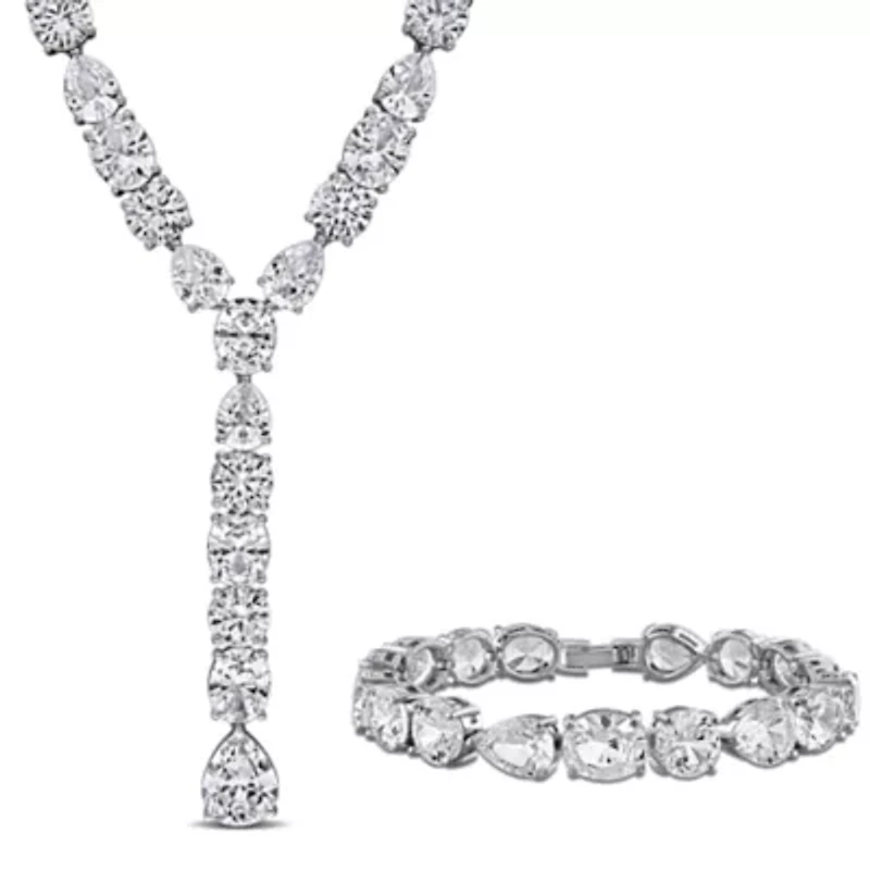 Elevate your elegance with this 2-piece created white sapphire necklace and bracelet set. Set in polished silver, the sparkling sapphires catch the light beautifully, creating a radiant shimmer. The versatile bracelet can also be used as an extender, allowing the necklace to reach up to 23 inches for a customized look. A timeless set that combines sophistication, style, and refined versatility. 2 Lobster closure, 78 created white sapphire Polished finish Prong setting Warranty available, 60 days Thailand Imported Product Specifications 16" & 7" & 23" 163.27 ct. t.g.w. created white sapphire Material & Care Sterling Silver Metal, Sterling silver Clean with a soft cloth.