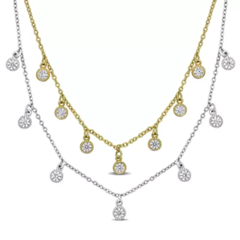 Elevate your elegance with this created white sapphire 2-piece station necklace set in two-tone sterling silver. The sparkling sapphires catch the light beautifully, creating a radiant and sophisticated shimmer. The versatile design, with an adjustable length, adds refined charm to any outfit, perfect for both everyday wear and special occasions. A timeless set that blends style, grace, and enduring beauty. 2 Spring ring clasp, 14 created white sapphire Polished finish Bezel setting Warranty available, 60 days Thailand Imported Product Specifications 18" 1.26 ct. t.g.w. created white sapphire Material & Care Two-Tone Silver Metal, Two-Tone Clean with a soft cloth.